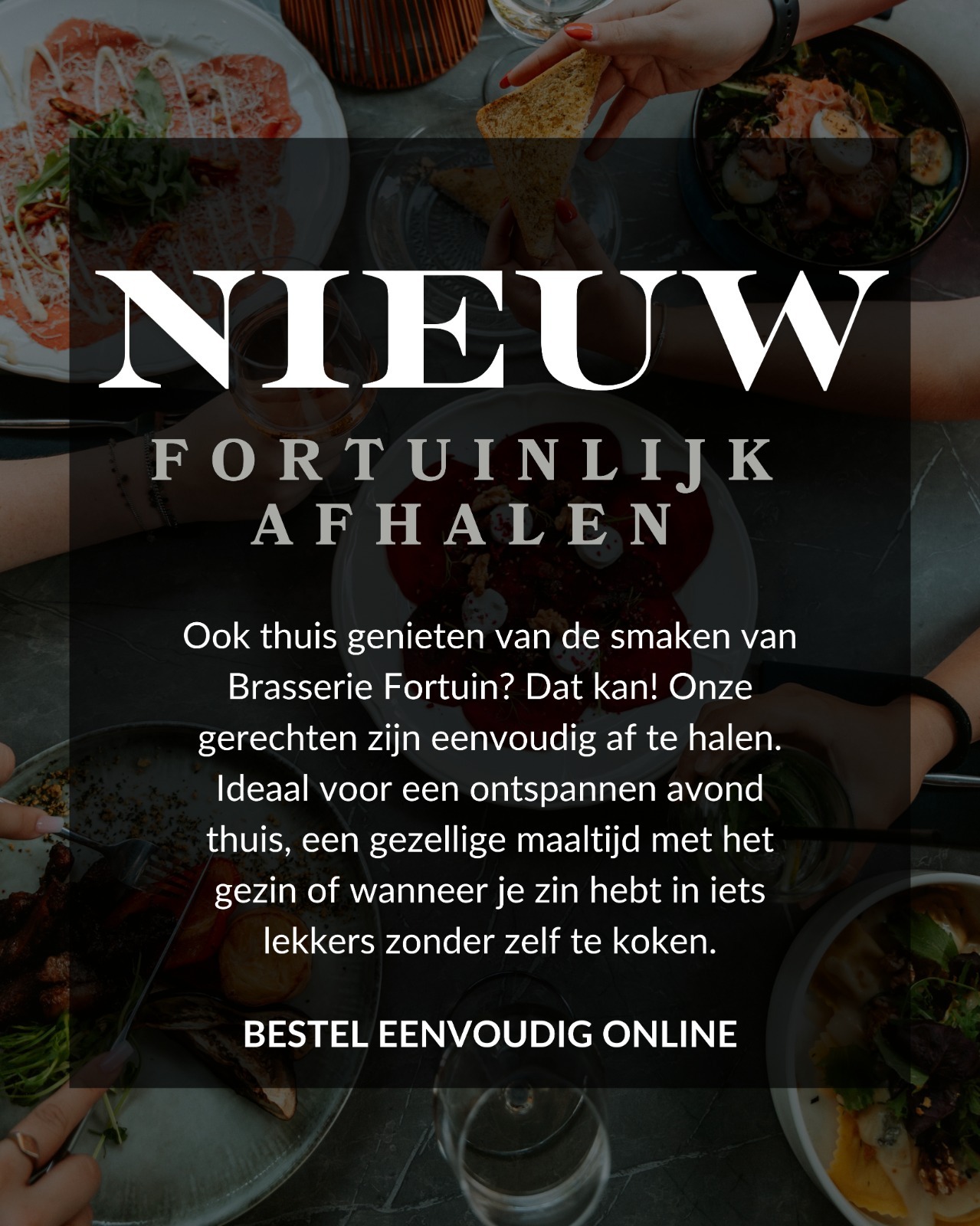 Ook thuis genieten van de smaken van Brasserie Fortuin? Dat kan! Onze gerechten zijn eenvoudig af te halen. Ideaal voor een ontspannen avond thuis, een gezellige maaltijd met het gezin of wanneer je zin hebt in iets lekkers zonder zelf te koken.
